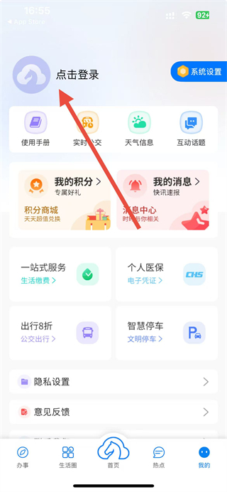 2、在个人页面,点击点击登录区域,进入登录界面。