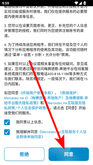 1、打开奔驰,在用户协议及隐私政策弹窗中,点击同意。