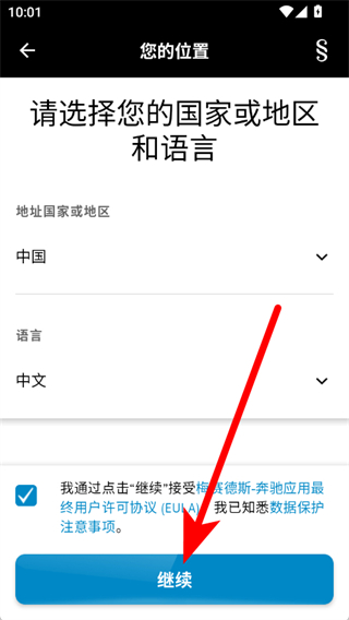 3、选择国家或地区和语言,勾选同意相关协议后,点击继续。