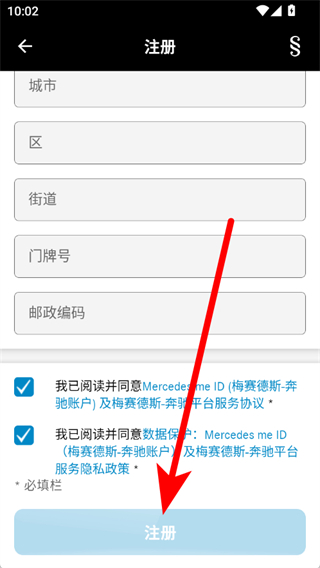 4、填写城市、邮政编码等注册信息,勾选同意后,点击注册按钮,完成账号注册流程。