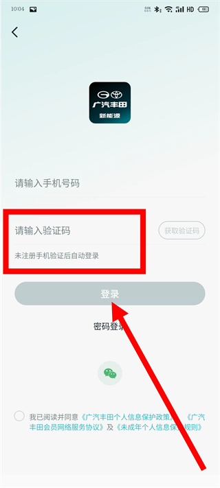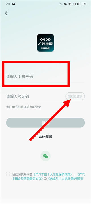 3、在登录页面,输入手机号码,点击获取验证码。