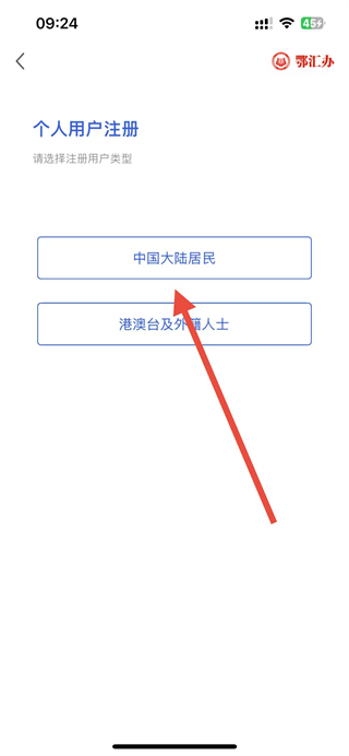 3、在个人用户注册页面选择中国大陆居民注册用户类型,进入信息填写页面。