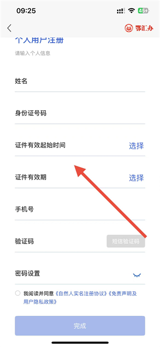 4、在信息填写页面依次输入个人信息,设置密码并同意协议后,点击完成即可完成个人注册。