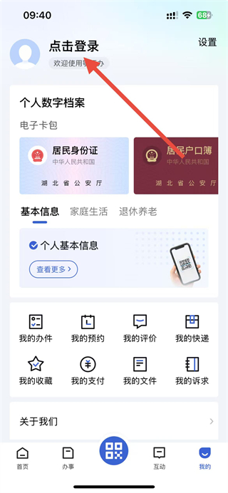 1、打开鄂汇办app,在我的页面点击登录区域,进入登录界面。