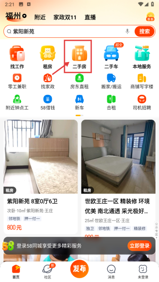 1、打开同城服务APP,点击二手房分类图标,进入二手房专区。
