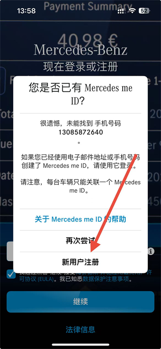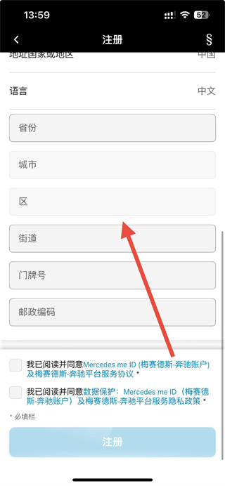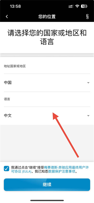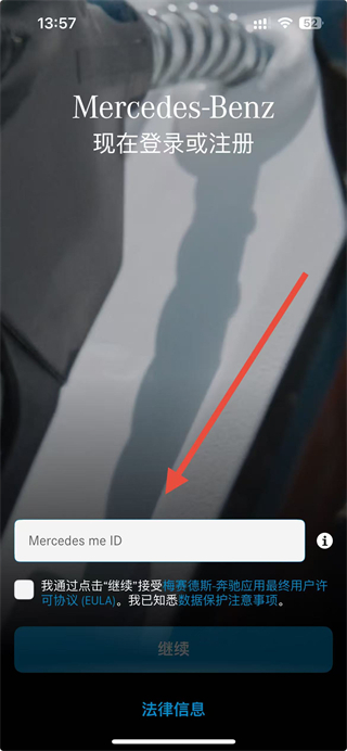 1、在奔驰app登录注册界面,输入Mercedes-me-ID,勾选同意用户许可协议,点击继续。