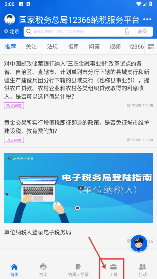 1、打开12366纳税服务平台APP,点击底部工具选项,进入工具页面。