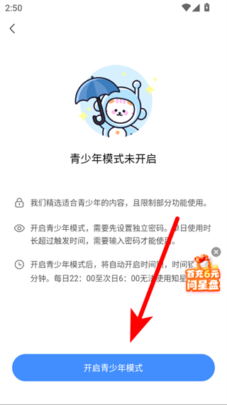 3、在青少年模式说明页面点击开启青少年模式,进入设置密码页面。