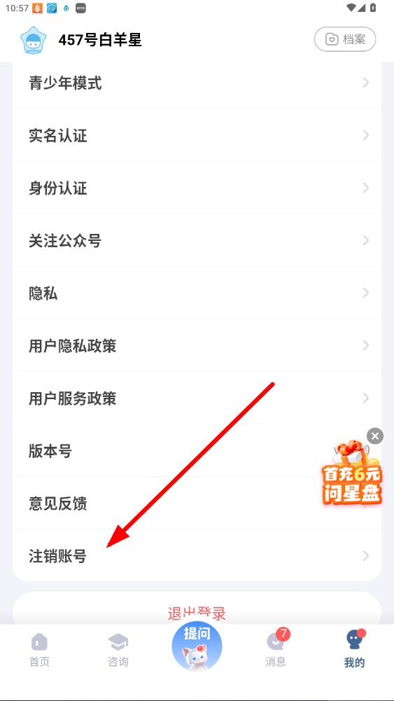 2、在个人页面中,向下滑动,点击注销账号选项。