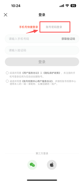 3、在登录界面,点击账号密码登录选项,切换至账号密码登录页面。