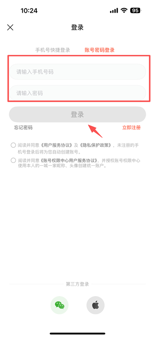 4、在账号密码登录页面,输入手机号和密码并勾选协议后,完成账号登录操作。