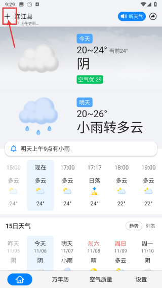 1、打开天气类APP,点击左上角+号图标,进入城市管理页面。