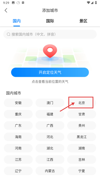 3、在添加城市界面,点击北京选项,切换至北京市天气页面。