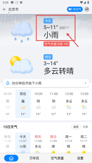 4、在北京市天气页面,查看今天小雨、气温5~11°的天气信息。