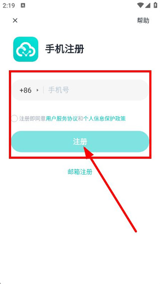 3、在手机注册页面,输入手机号并同意后点击注册,进入短信验证码页面。