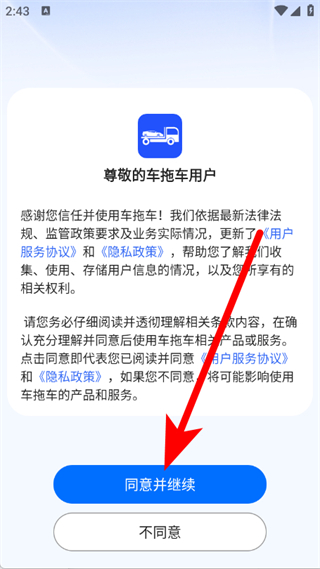 1、打开车拖车平台,在弹窗中,点击同意并继续。