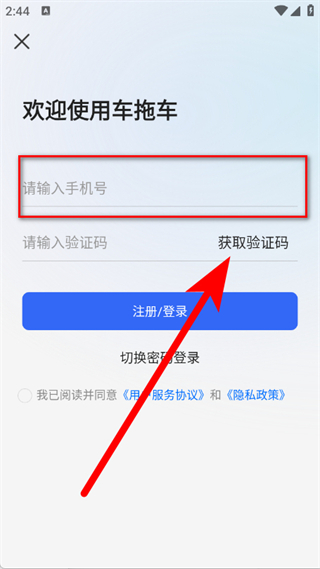3、在登录页面,输入手机号,点击获取验证码。