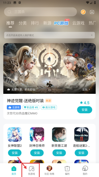1、打开游戏平台类APP,点击底部找游戏选项,进入游戏分类页面。