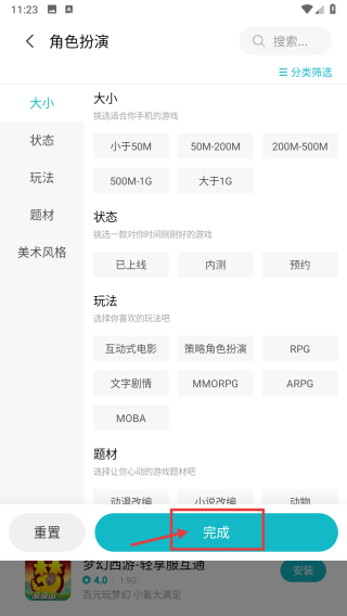 3、在角色扮演游戏列表页,完成筛选后点击完成按钮,确认筛选条件。