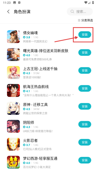 4、在筛选后的游戏列表中,点击倩女幽魂游戏旁的安装按钮,开始游戏安装操作。