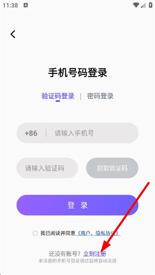 2、在手机号码登录页面,点击立刻注册,进入页面。