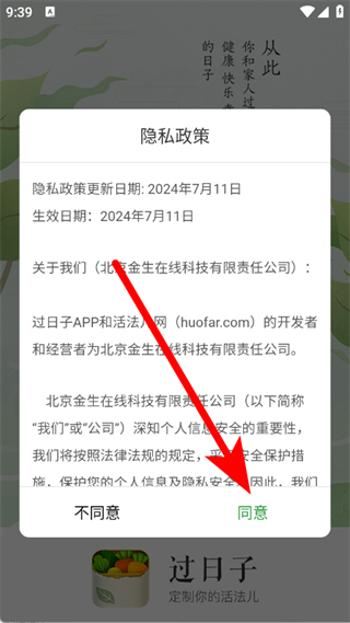1、打开过日子,在隐私政策弹窗中点击同意。