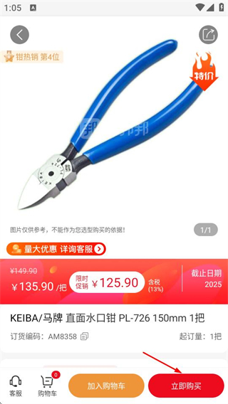 2、在商品详情页点击立即购买,进入规格选择界面。