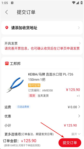 4、在提交订单界面添加收货地址、完善发票信息后点击提交订单完成购买。