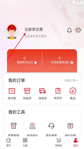 2、在个人中心界面点击注册享优惠区域,进入登录界面。