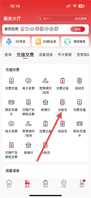 2、在服务大厅界面,找到为他充选项并点击,进入为他充界面。