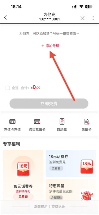 3、在为他充界面,点击添加号码选项,进入添加号码界面。