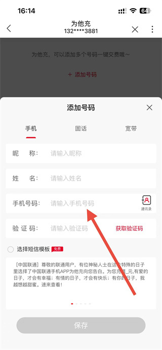 4、在添加号码界面,输入昵称、姓名、手机号码和验证码,点击保存,可添加多个号码后进行话费充值操作。