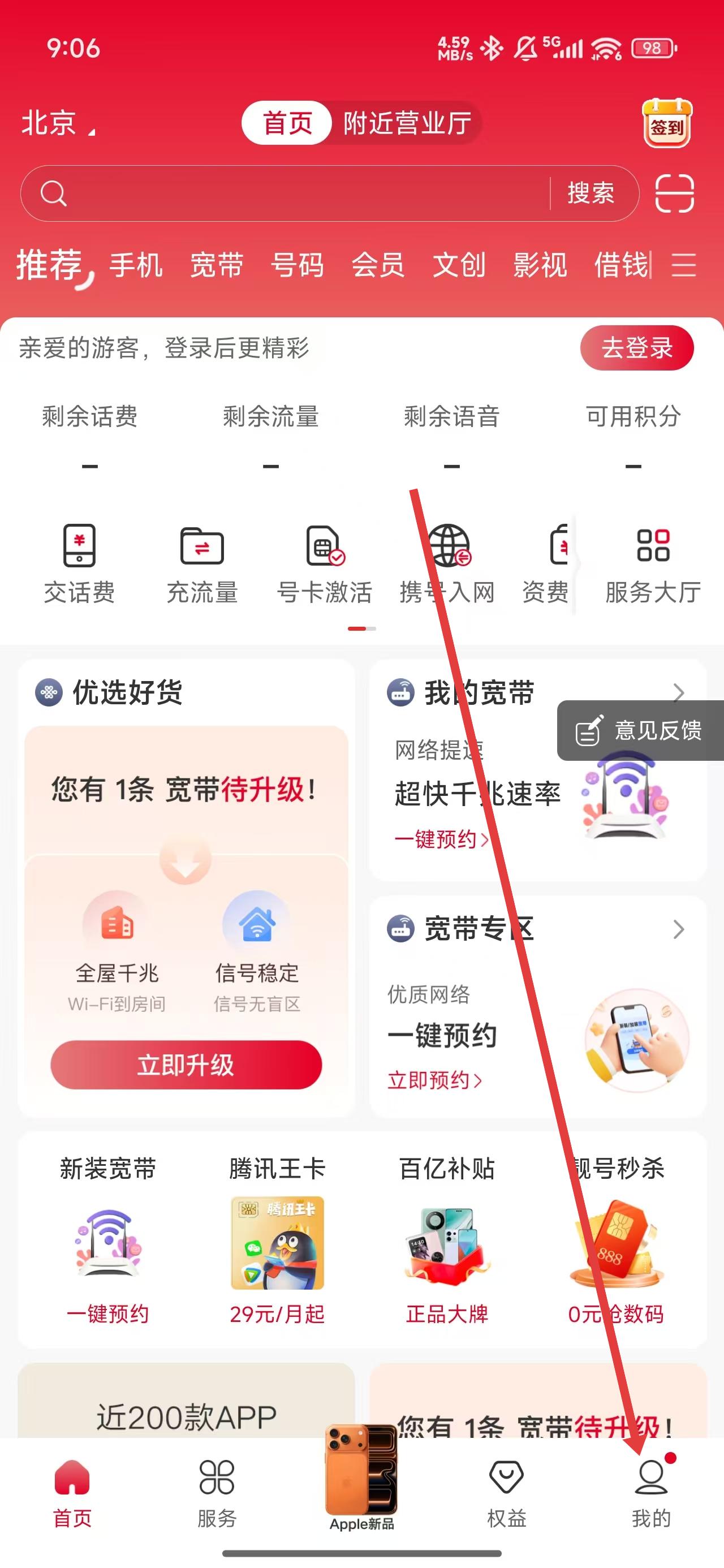 1、可以通过点击中国联通首页下我的按钮,进入我的主页中。