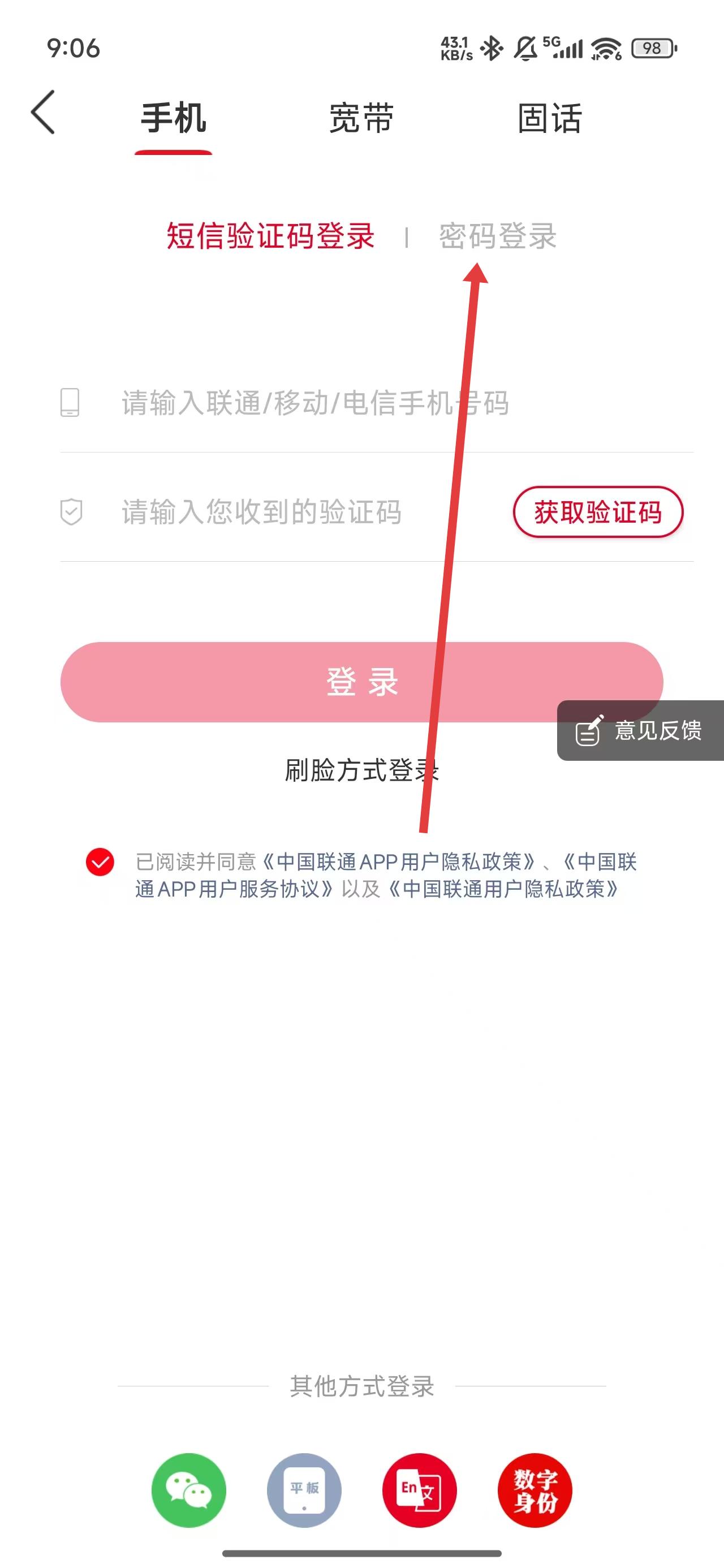 3、在进入到登录页面后,可以点击密码登录按钮,切换登录方式。