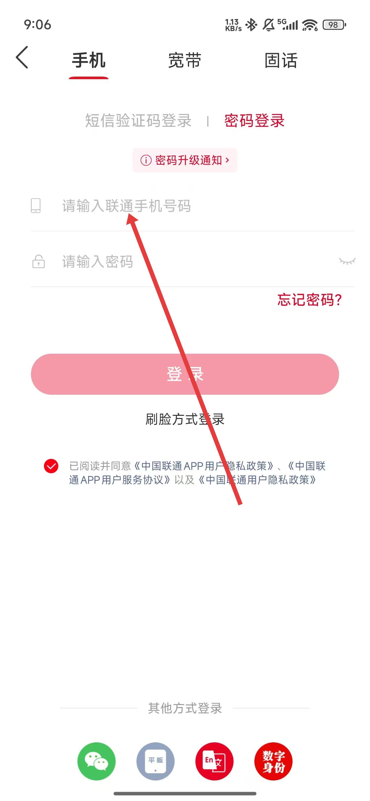 4、在切换为密码登录方式后,点击输入框依次输入框手机号和密码,即可完成登录。