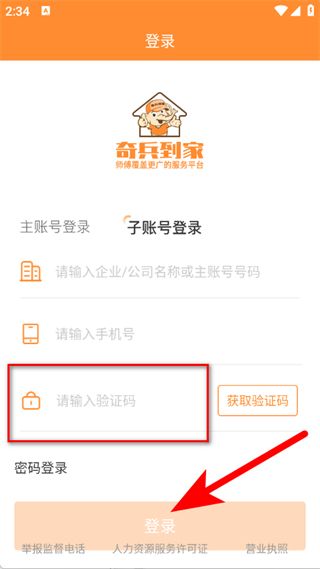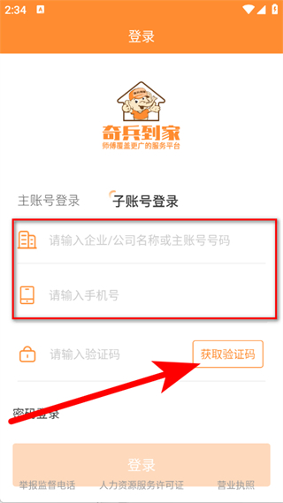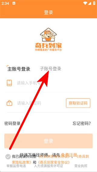 1、打开奇兵到家安装平台,进入登录页面,点击子账号登录。