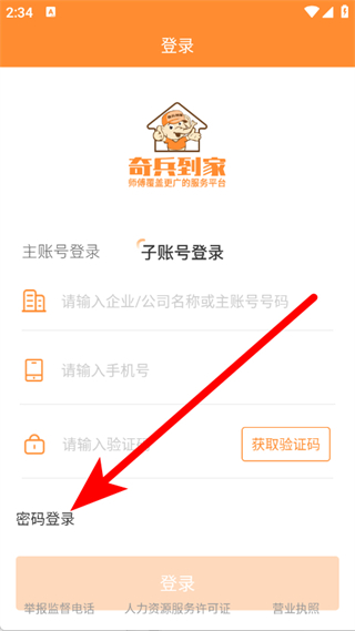 2、进入子账号登录页面,点击密码登录,进入登录页面。