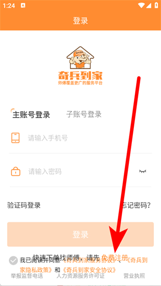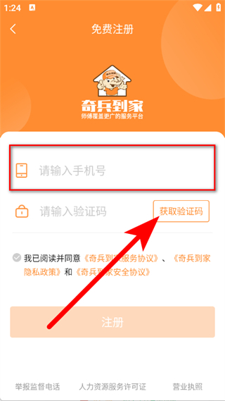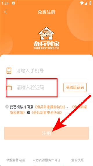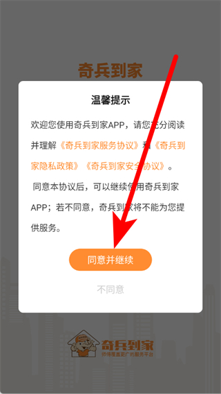 1、打开奇兵到家,在弹窗中点击同意并继续,进入登录界面。