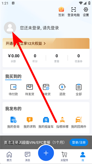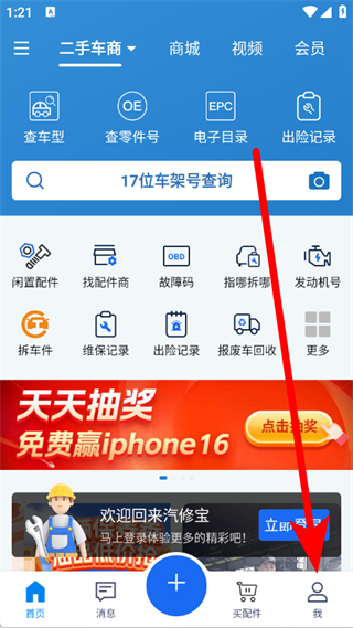 1、打开汽修宝,在首页底部点击我,进入我的页面。