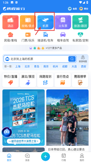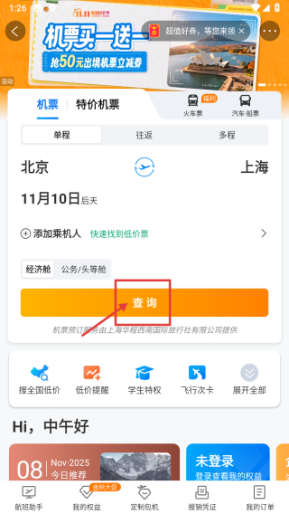 1、打开旅行类APP,点击机票分类标签,进入机票查询页面。