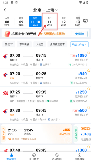 3、在航班列表页面,选择11月11日周二的航班日期,筛选出当日航班。