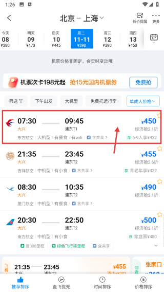 2、在机票查询页面,选择出发地北京、目的地上海,点击“查询”按钮,进入航班列表页面。
