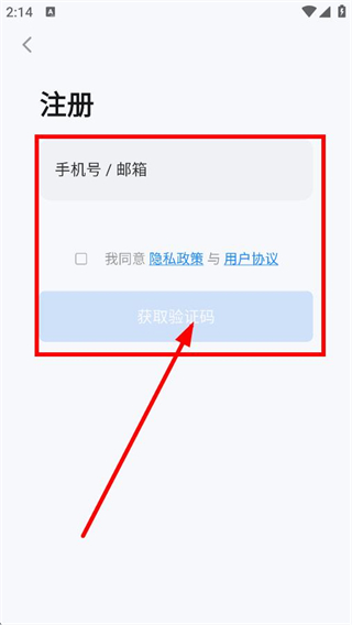 3、在注册页面,输入手机号/邮箱,同意后点击获取验证码。
