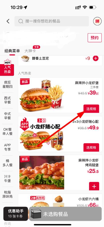 2、进入点餐界面,浏览菜单,选择想购买的餐品,点击餐品右侧的选规格按钮。