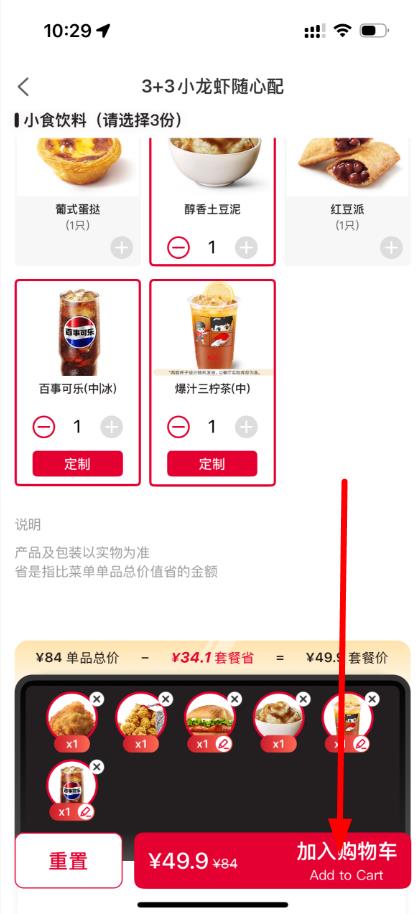 3、在餐品规格选择页面,按需选择小食、饮料等具体品类和数量,确认后点击加入购物车,完成所有想点的餐品选择后,进入购物车结算并填写送餐地址等信息。