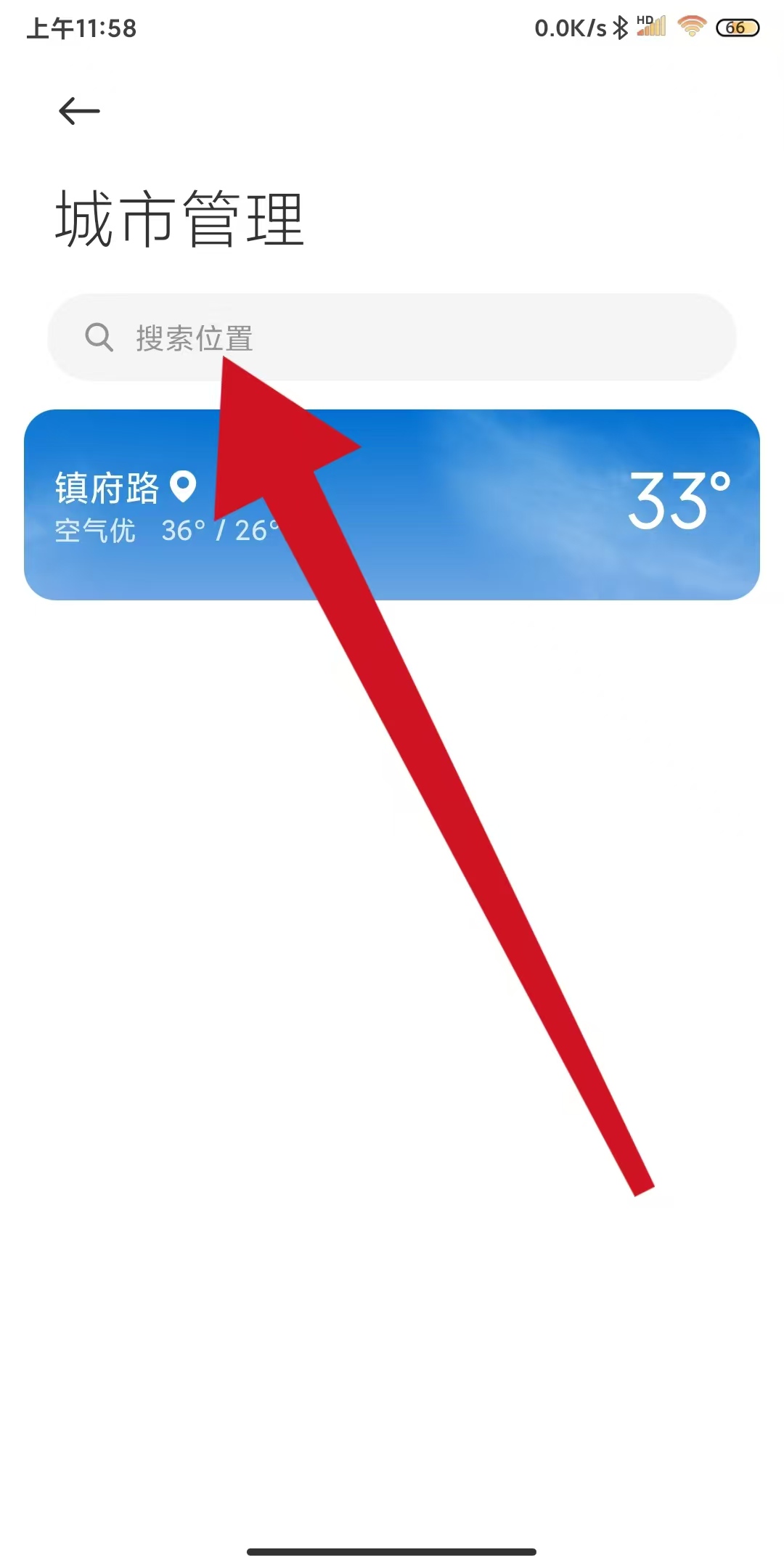 3、进入城市管理,在天气界面点击搜索栏搜索位置。