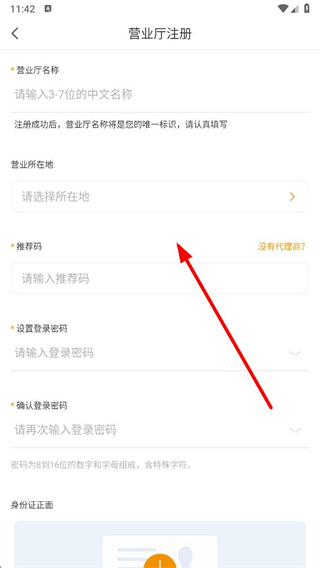 4、在注册页面,依次填写营业厅名称、营业所在地、推荐码、登录密码并确认,上传身份证正面完成注册。