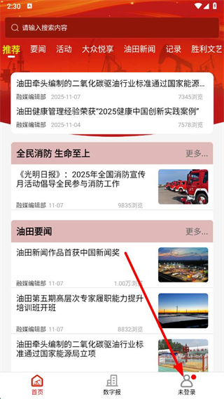 1、在胜利职工e家首页,点击右下角未登录进入账号登录页面。