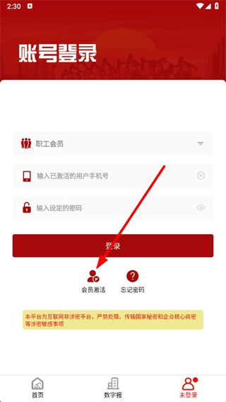 2、在账号登录页面,点击会员激活选项进入激活流程。