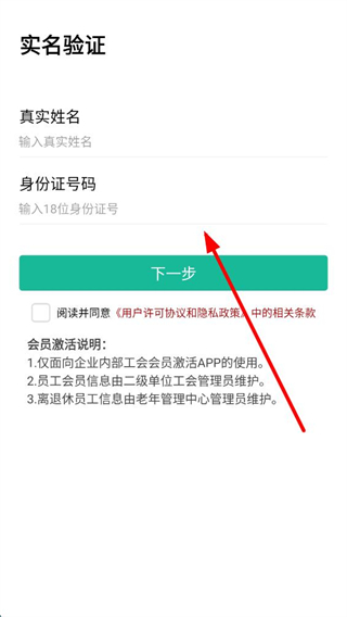 3、在实名验证页面,输入真实姓名和身份证号码,勾选同意协议后点击下一步完成激活。